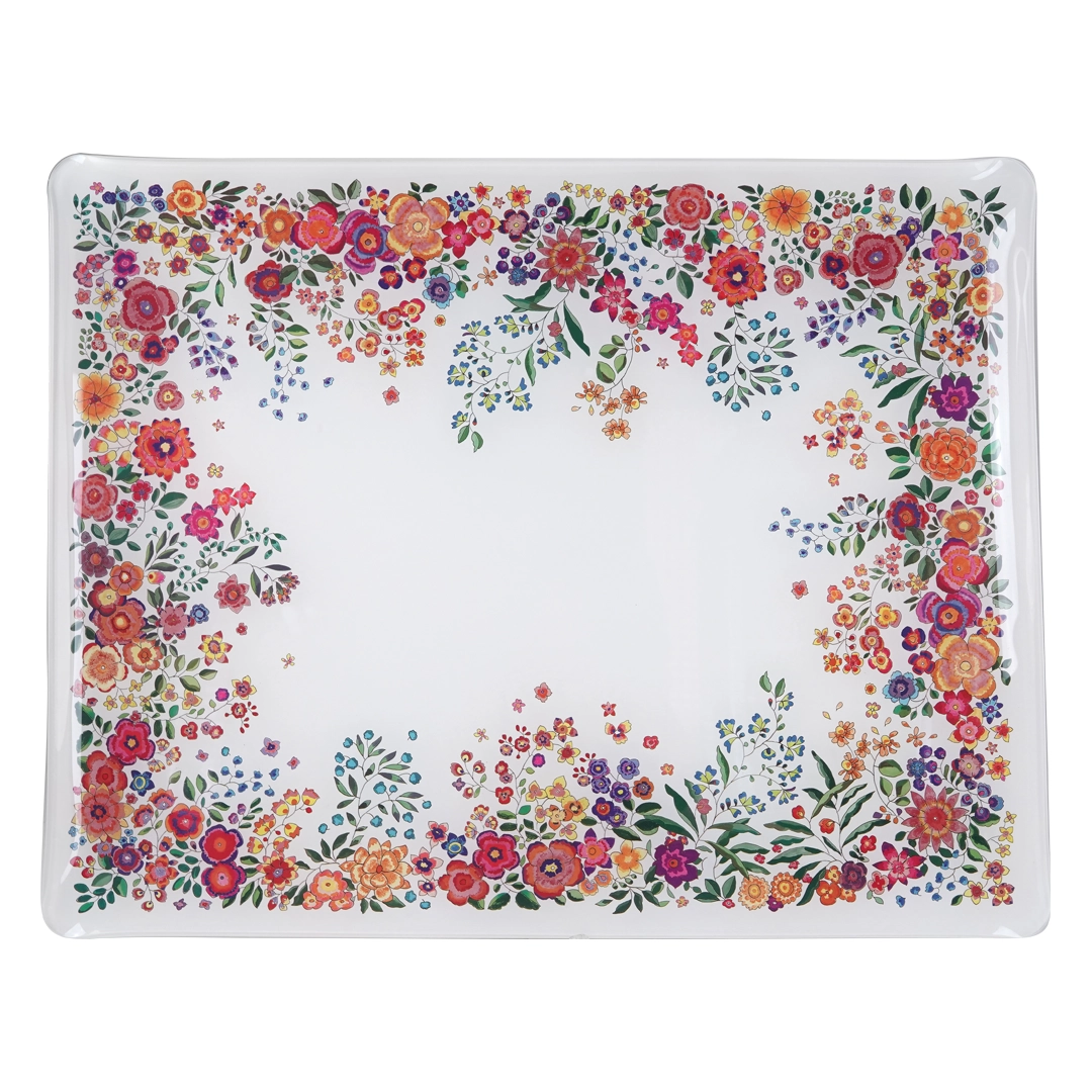 Las asas recortadas facilitan el agarre y hacen que la bandeja sea cómoda de manejar incluso cuando va cargada. El acrílico es ligero, resistente y fácil de limpiar con un paño húmedo, lo que convierte la bandeja en una opción práctica para el uso diario en cocina, salón o terraza. Además, protege la ilustración floral y mantiene sus colores vivos durante más tiempo.