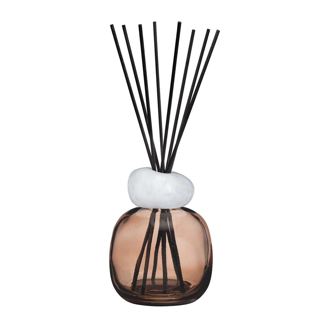 El bouquet perfumado Minéral Prune Quartz Blanc de Maison Berger combina un diseño chic con una fragancia envolvente que transforma cualquier estancia en un rincón elegante. Su frasco de vidrio teñido en un profundo tono «prune» (ciruela) se realza con un anillo decorativo de efecto mármol blanco, lo que aporta un acabado mineral sofisticado. Este contraste de colores refleja la armonía entre la naturaleza y la modernidad.