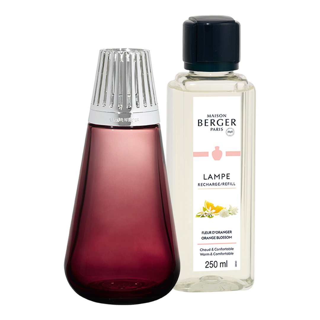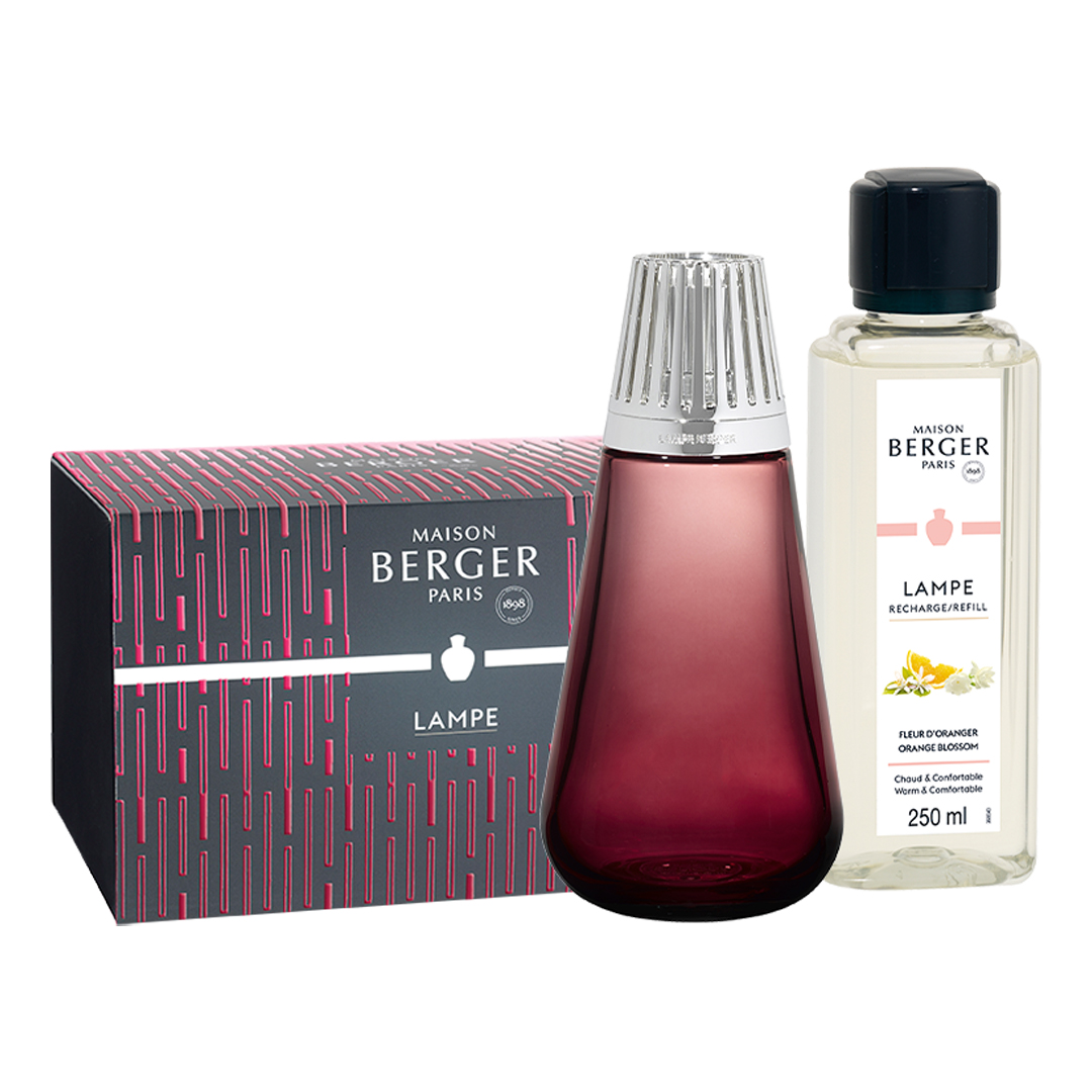Cofre Lámpara Berger Amphora Framboise: vidrio lacado frambuesa con montura plateada. Incluye recarga Fleur d’Oranger 250 ml, quemador y accesorios. Diseño decorativo con aroma floral envolvente.