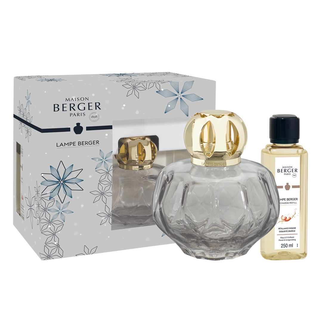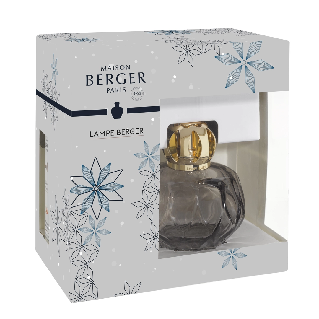Cofre Lámpara Berger Rosalie Grise de Maison Berger Paris, set premium con lámpara catalítica en vidrio gris origami, recarga Pétillance Exquise 250ml, quemador, apagador y embudo. Difusión hasta 40h, purifica y perfuma 80m² con aroma festivo de bergamota, rosa y vainilla.
