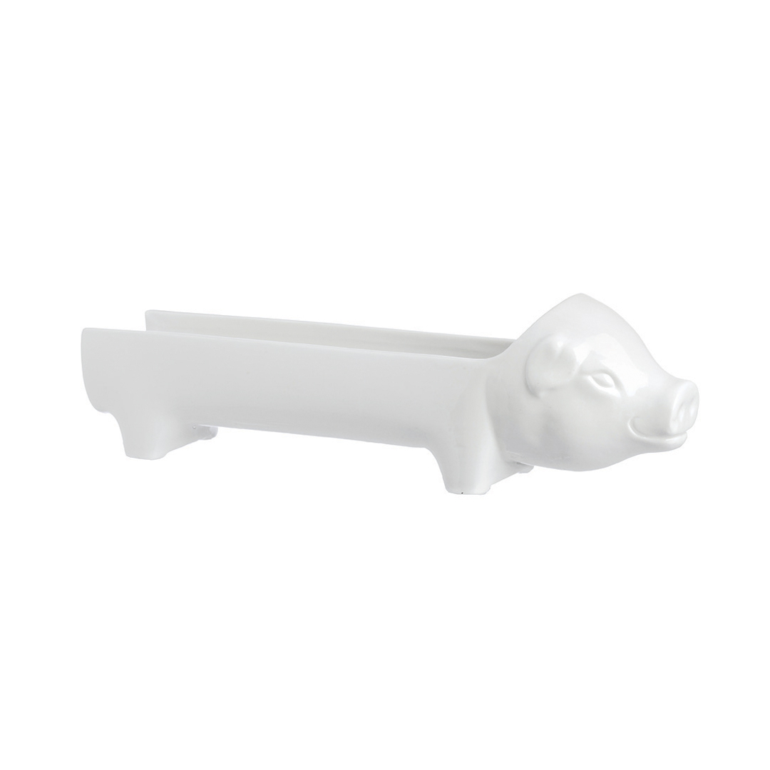 Fuente de porcelana blanca en forma de cerdito para servir salami y embutidos. Diseño exclusivo de la línea Fattoria Piglet, resistente y fácil de limpiar, ideal para presentaciones elegantes y originales.