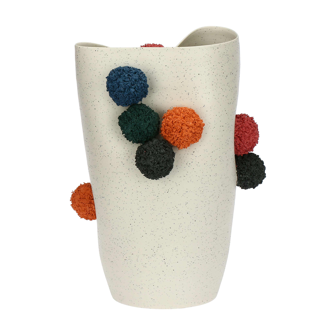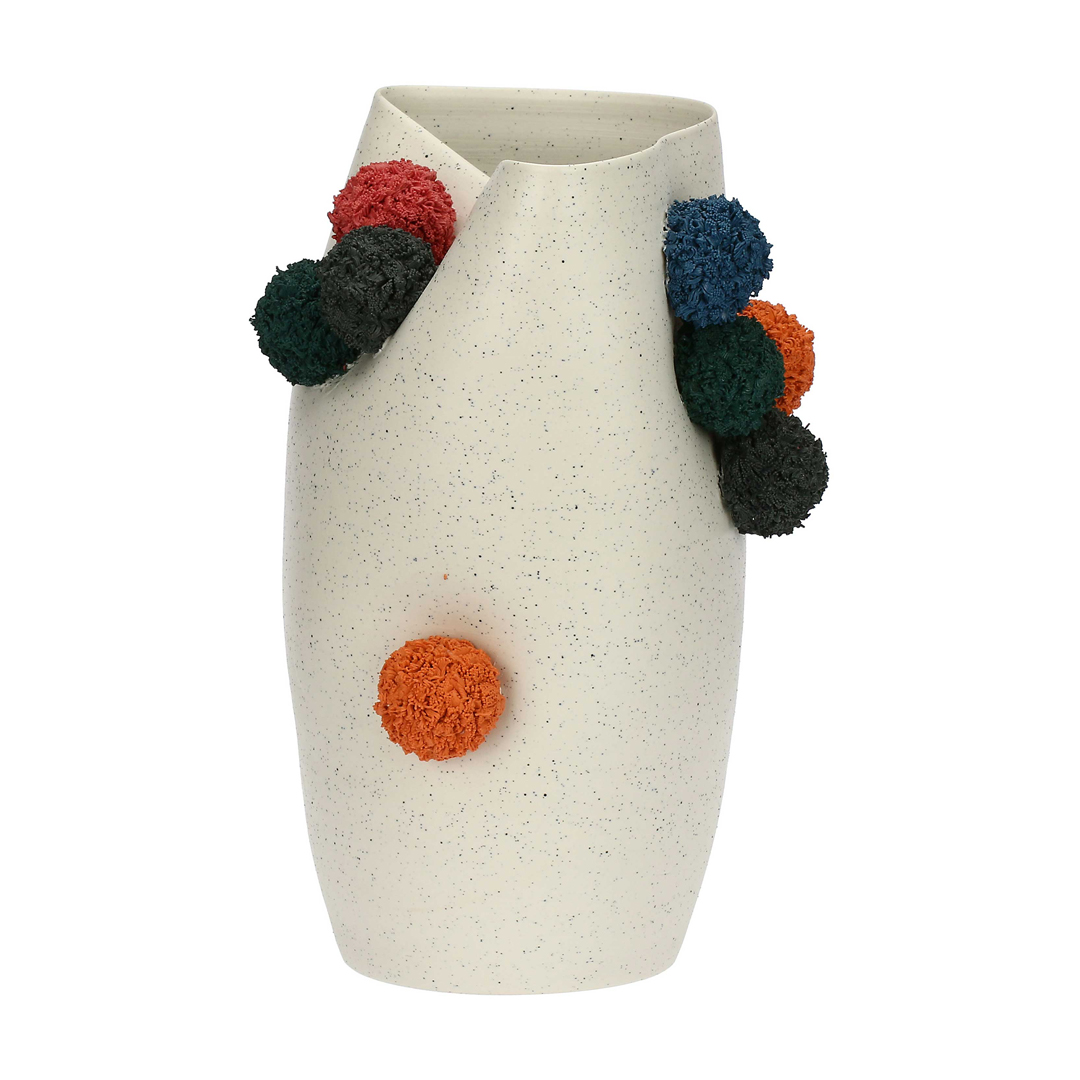 Jarrón con Pompón Mediano de Rituali Domestici: cerámica artesanal en tono crema con pompones de colores, diseño moderno y textura natural. Ideal para dar un toque original y artístico al hogar. 25cm de alto