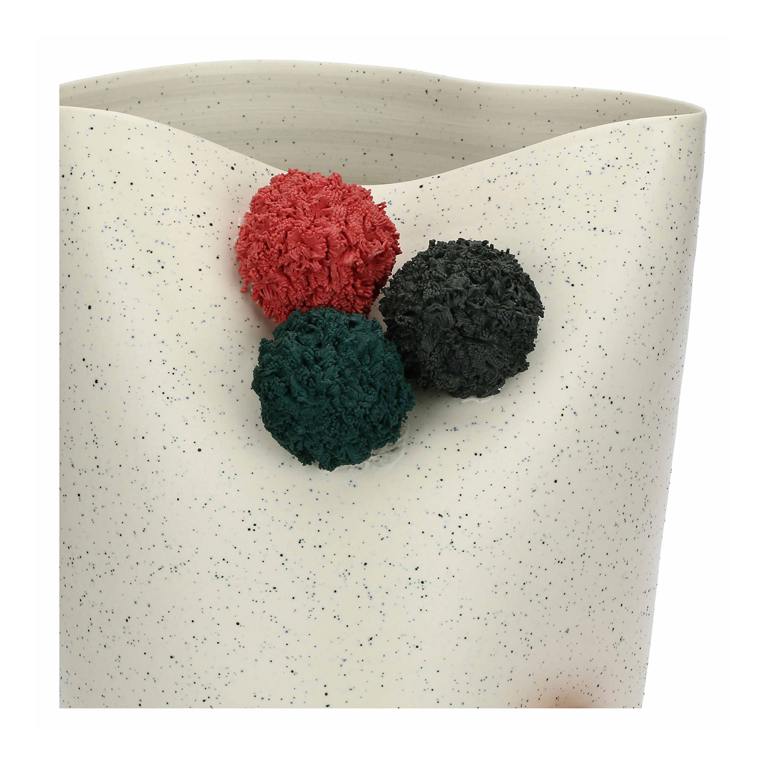 El jarrón con pompón mediano de Rituali Domestici es una pieza decorativa única que combina diseño contemporáneo y artesanía con un toque lúdico y original. Su forma orgánica y su superficie en tono blanco crema con textura moteada transmiten naturalidad y elegancia, mientras que los pompones de colores —en tonos verde, rojo, azul y calabaza— aportan un contraste vibrante que llena de vida cualquier espacio.