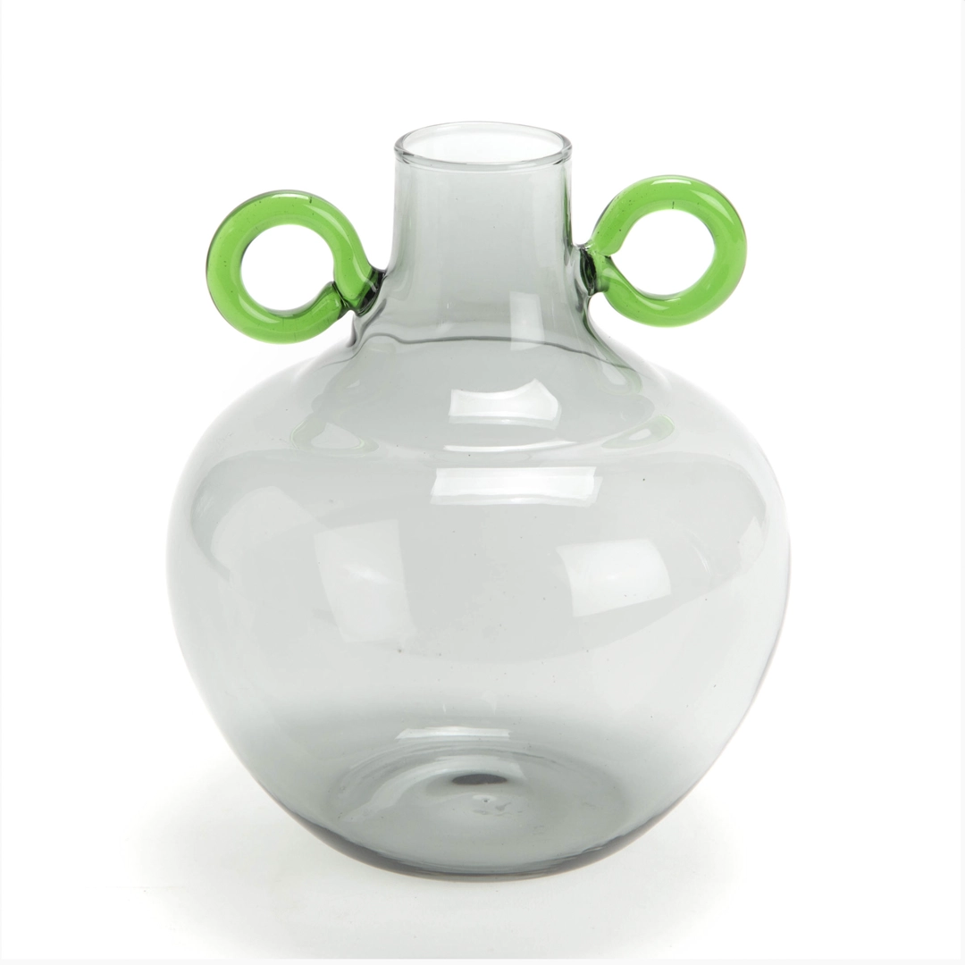 Jarrón Redondo Grisanse Verte de Amadeus, vidrio soplado gris claro transparente con asas verdes. Tiene una altura de 16 cm, un diámetro de 15 cm, y 0,20 kg de peso. Diseño minimalista y colorido para flores o decoración.
