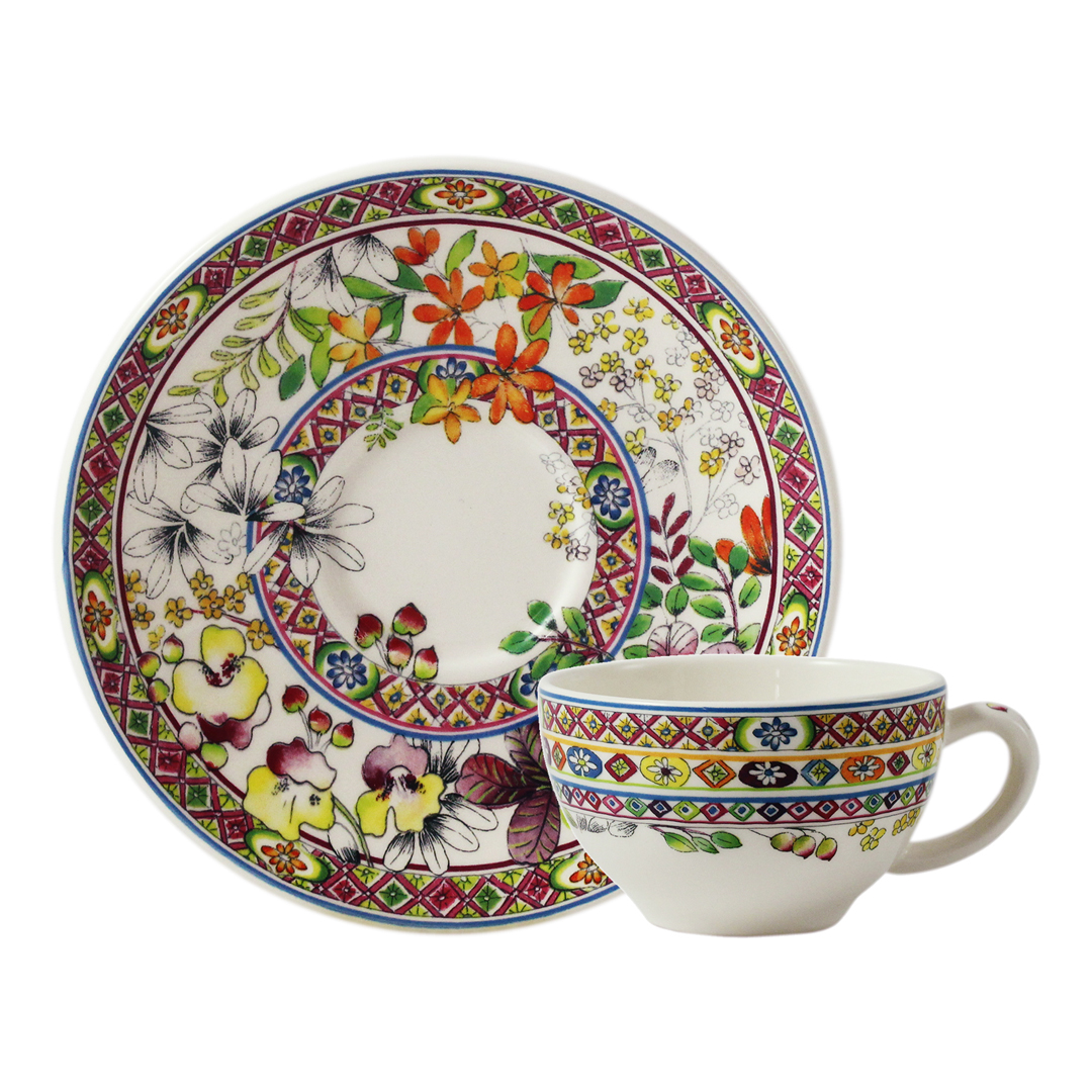 Juego de té Bagatelle (2 uds.) de Gien France. Incluye dos tazas de 16cl y dos platillos de 15,2cm de diámetro con motivos florales y geométricos. Apto para lavavajillas y microondas (solo para recalentar).