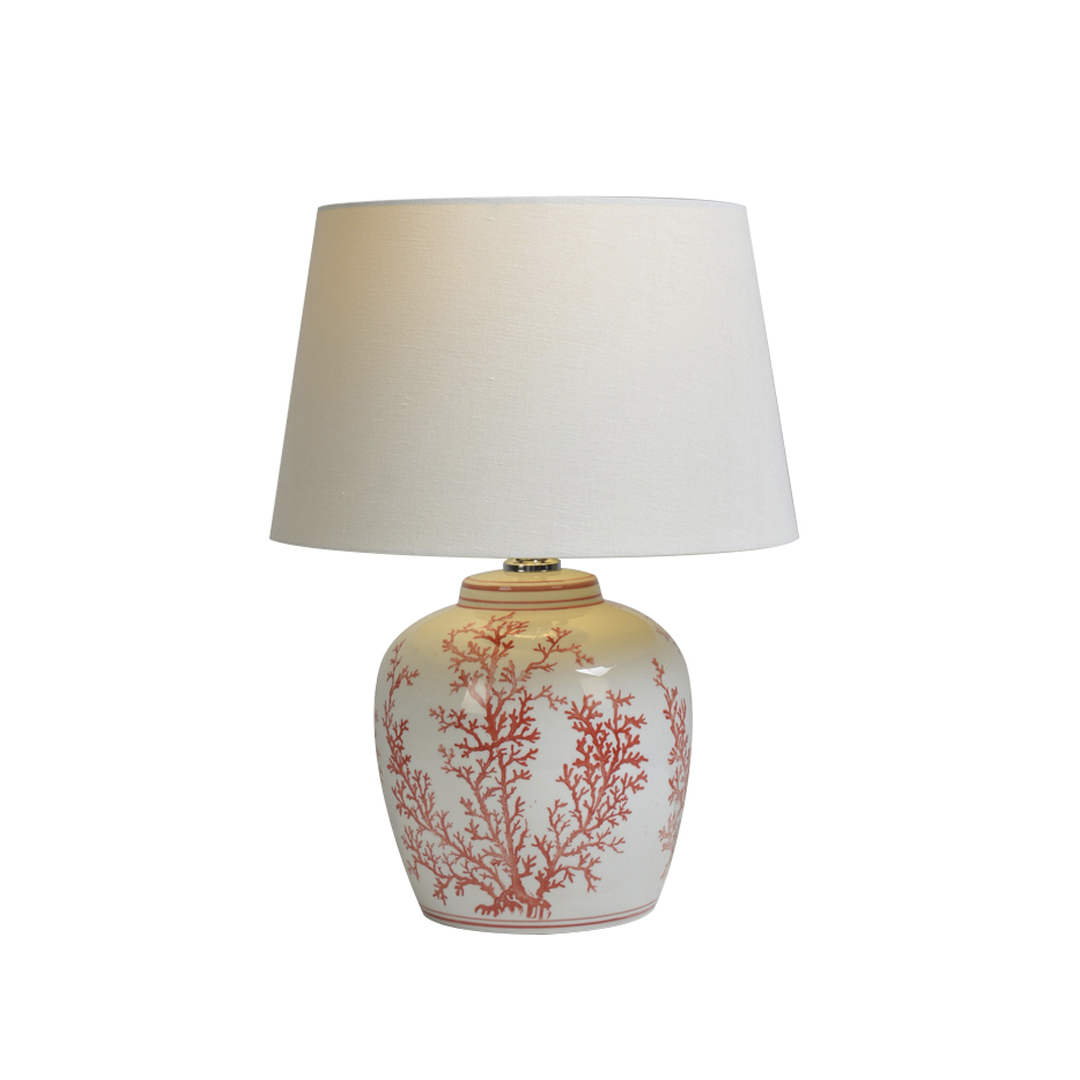 Material: 100% porcelana, resistente y fácil de limpiar. Motivos coralinos destacan sobre el fondo neutro y aportan color. Base firme y soporte estable para uso seguro. La lámpara Malibu de Ishela es compatible con bombillas de rosca estándar, apta para LED, bajo consumo o incandescentes. Recomendable para iluminación ambiental o como punto de luz decorativo junto a sofás, camas o en zonas de lectura.