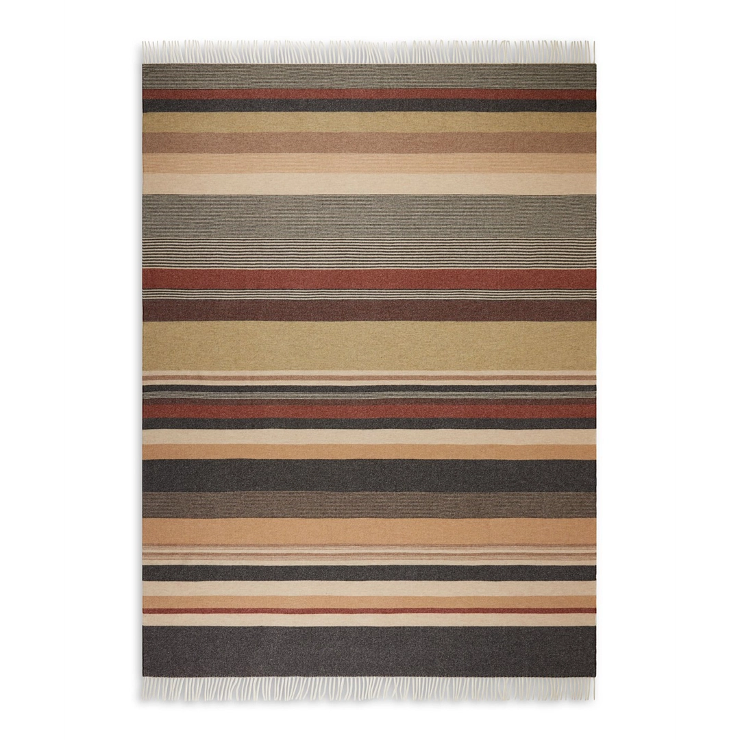 Manta Benjamin 130×190 cm, de rayas en tonos cálidos y gris antracita con flecos, tejido suave y envolvente. Está tejida en lana virgen con mezcla de algodón, ofreciendo suavidad, calidez y resistencia. Materiales naturales de alta calidad típicos de Missoni Home. Perfecta para sofá o pie de cama, aporta confort y estilo contemporáneo.