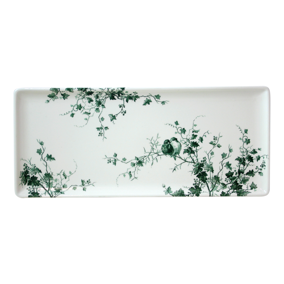 Plato Cake Les Oiseaux de Gien (36 × 15,50 cm), loza fina decorada con aves sobre ramas y motivos florales. Ideal para servir tartas con estilo natural y elegante.