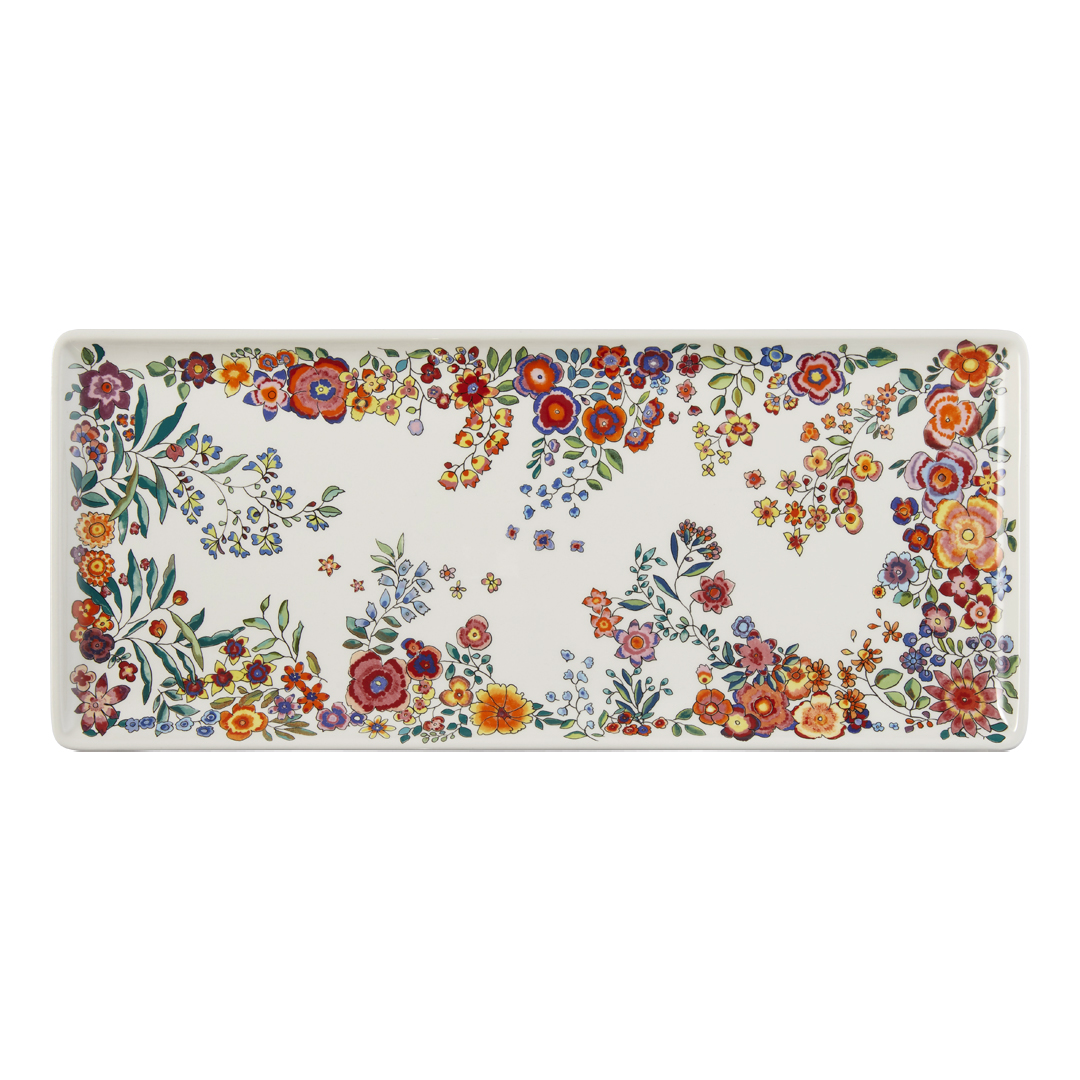 El plato tiene unas medidas de 36 × 15,50 cm y pesa aproximadamente 620 g, lo que le proporciona una buena presencia visual sin sacrificar practicidad.  Su tamaño alargado permite servir tartas, bizcochos y postres con gracia, facilitando tanto el corte como la presentación. Los motivos decorativos de Poésie combinan colores vivos como naranja, rosa y azul, aplicados sobre un fondo blanco, creando un contraste alegre que ilumina la mesa. Cada dibujo floral, cada tallo y hoja presenta una variación única, reflejo de la inspiración artística de su diseñadora.