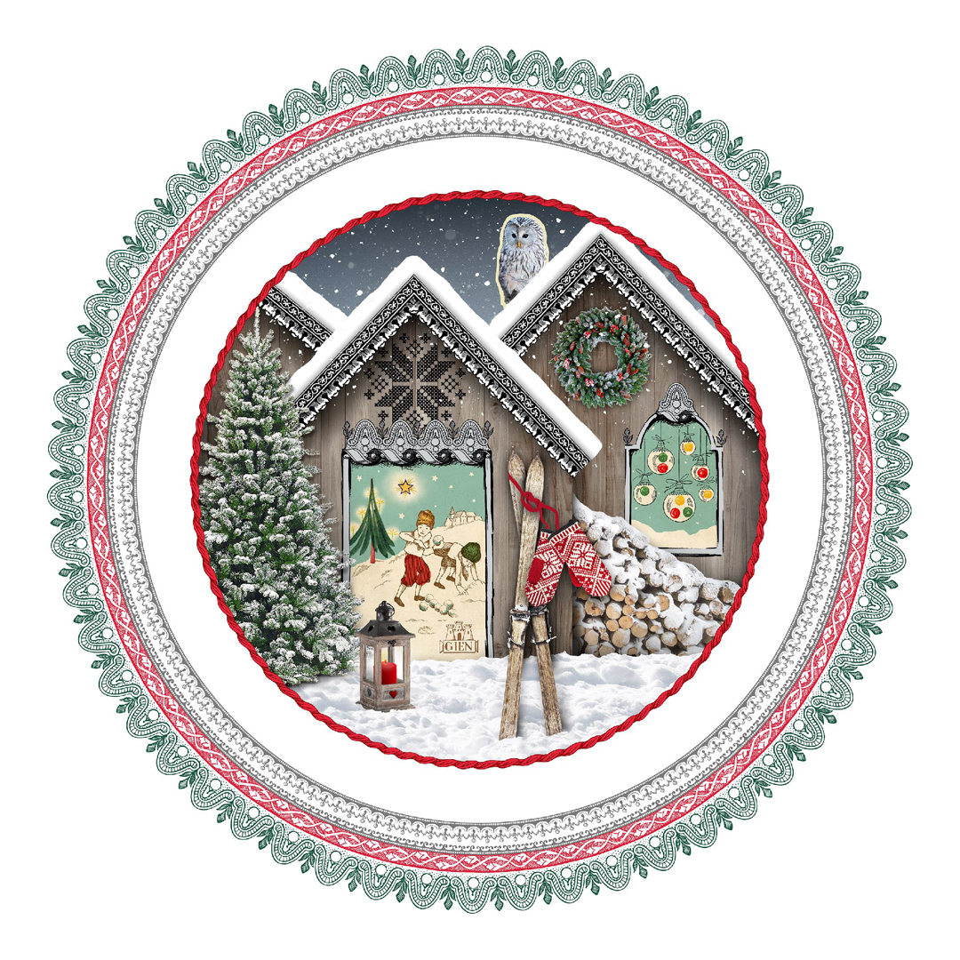 El diseño “Chalet” presenta una escena invernal llena de encanto, con un acogedor refugio de montaña cubierto de nieve, rodeado de abetos y detalles festivos en tonos rojos, verdes y blancos. La decoración, finamente ilustrada, transmite la atmósfera serena y familiar de los días de invierno, perfecta para acompañar las celebraciones navideñas.