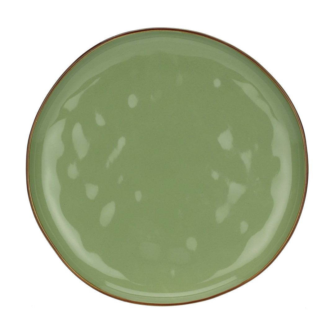 Plato llano Concerto Verde Oliva 27cm de Rose & Tulipani combina artesanía italiana y diseño mediterráneo. Fabricado en gres esmaltado con acabado reactivo, destaca por sus matices únicos en verde oliva y su elegancia natural. Ideal para platos principales, es apto para lavavajillas y microondas.