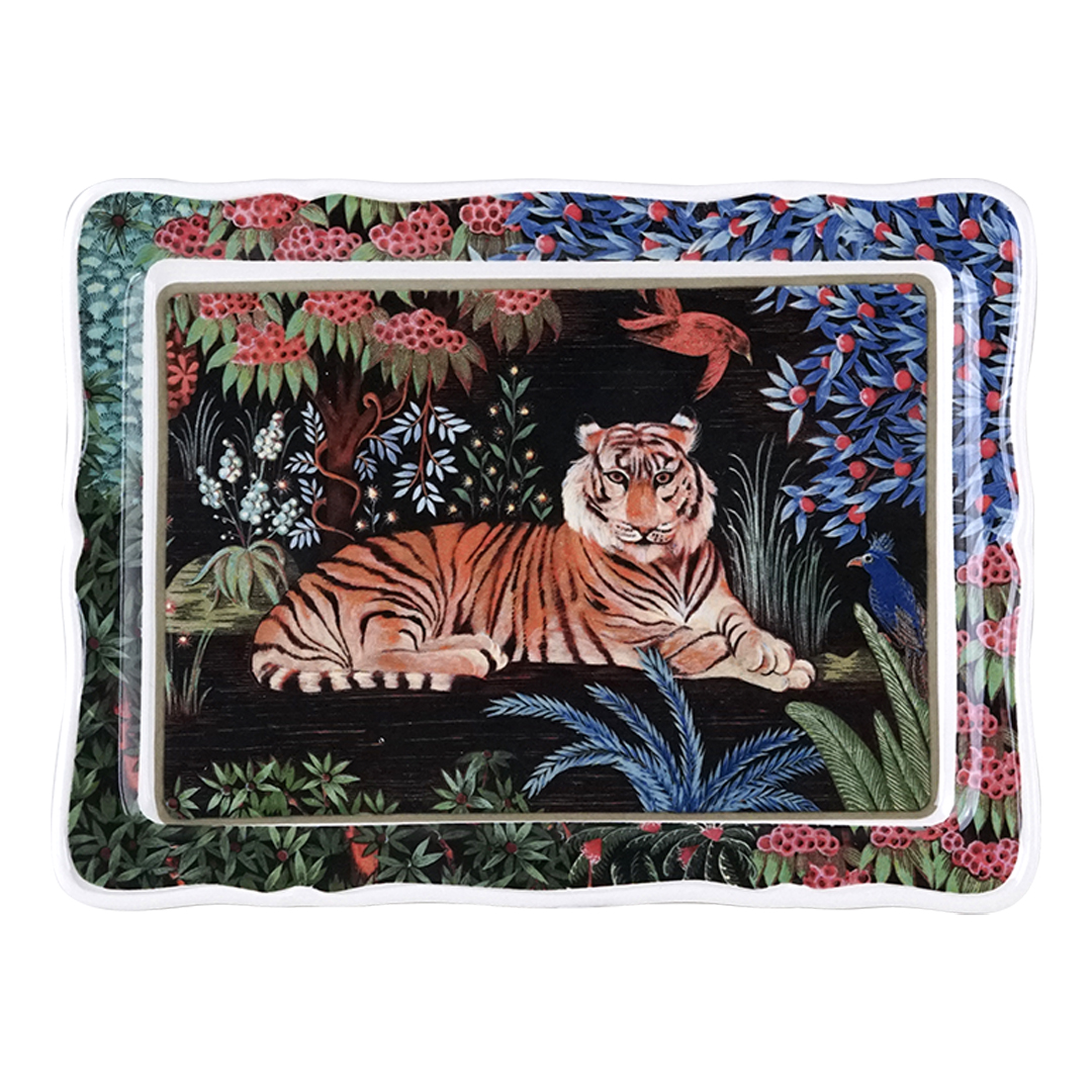 Fabricado en loza fina artesanal, este plato rectangular de 17,8 × 13,5 cm presenta un diseño lleno de vida y color sobre un fondo negro profundo que realza los detalles. Las ilustraciones muestran animales y flores tropicales pintados con delicadeza, creando una composición que celebra la belleza natural y el lujo decorativo. Cada pieza se elabora en los talleres de Gien, en el corazón de Francia, siguiendo un proceso de fabricación que combina técnicas tradicionales y acabados minuciosos.