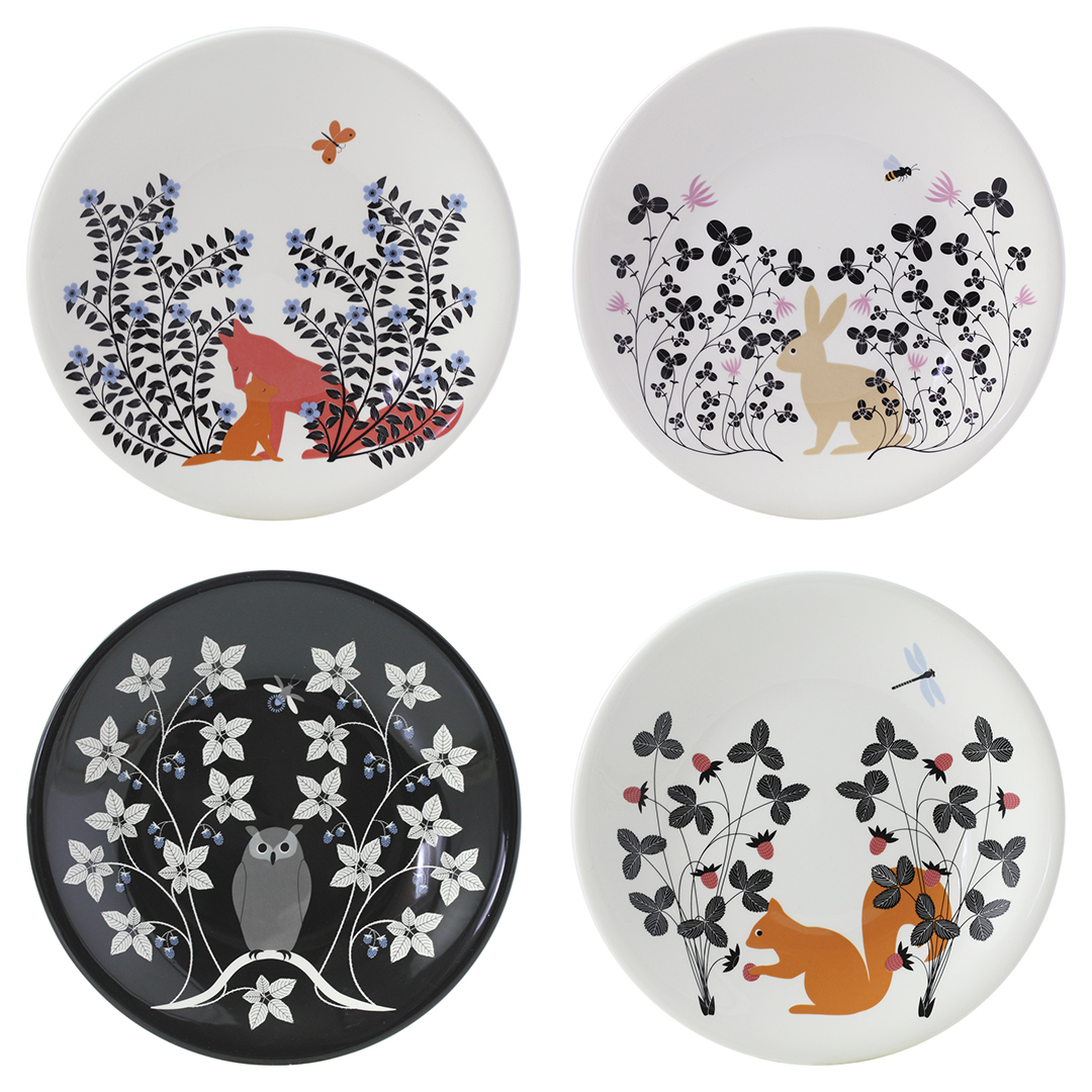 Platos de postre Le Secret (4uds.) incluye cuatro platos de loza francesa (22 cm) decorados con motivos de animales y naturaleza. Diseñado por Emile Vast. Aptos para lavavajillas.