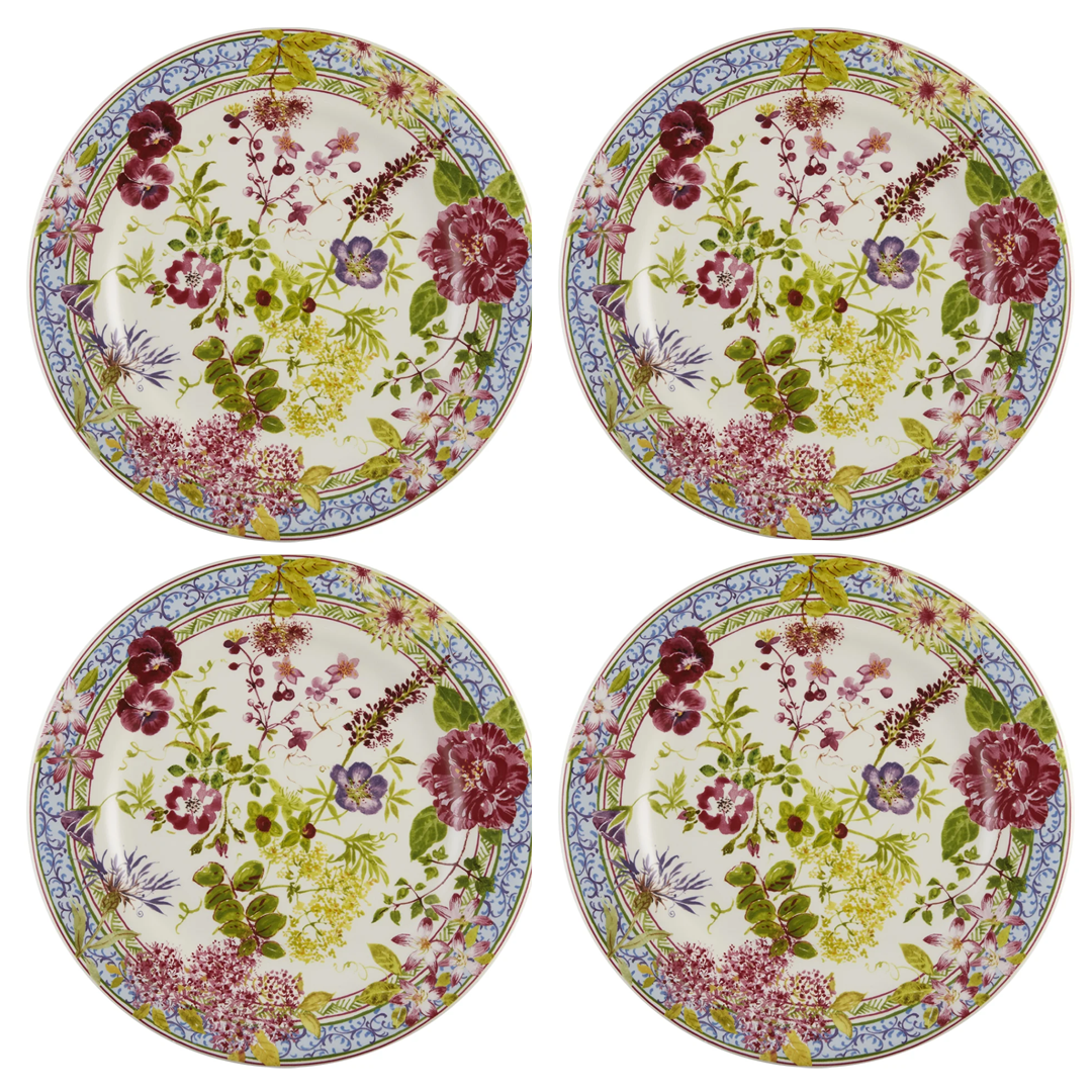 Set de 4 platos de postre Millefleurs Gien, loza francesa, diámetro 22 cm, y decoración floral multicolor. Aptos para lavavajillas y microondas, fabricación artesanal en Francia.