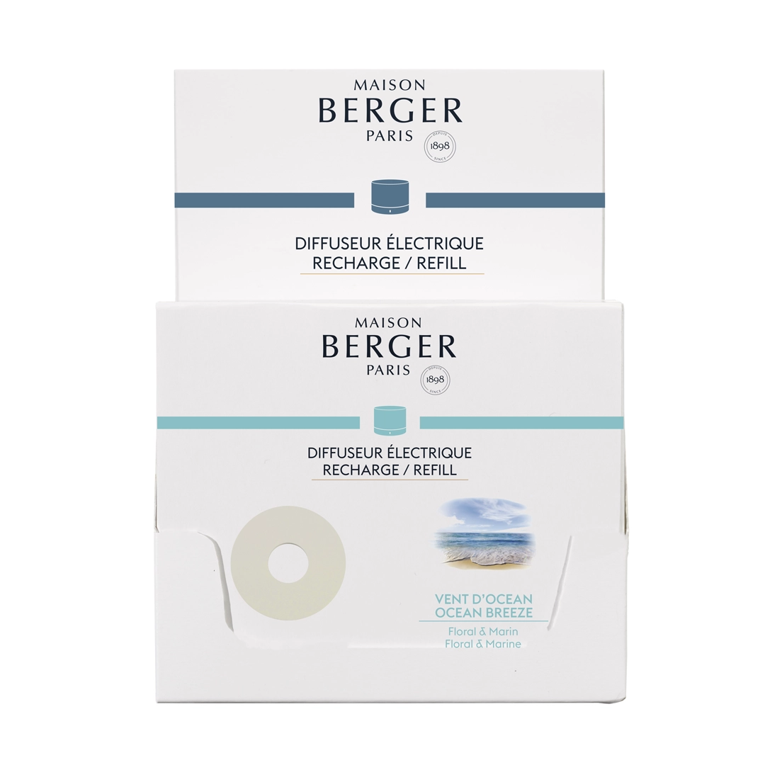 Recarga perfumada nómada Vent d’Océan de Maison Berger, con notas marinas, rosa y grosella negra; corazón floral de jazmín y lirio de los valles; fondo de almizcle, ámbar y maderas. Difusión seca durante 6-8 semanas.