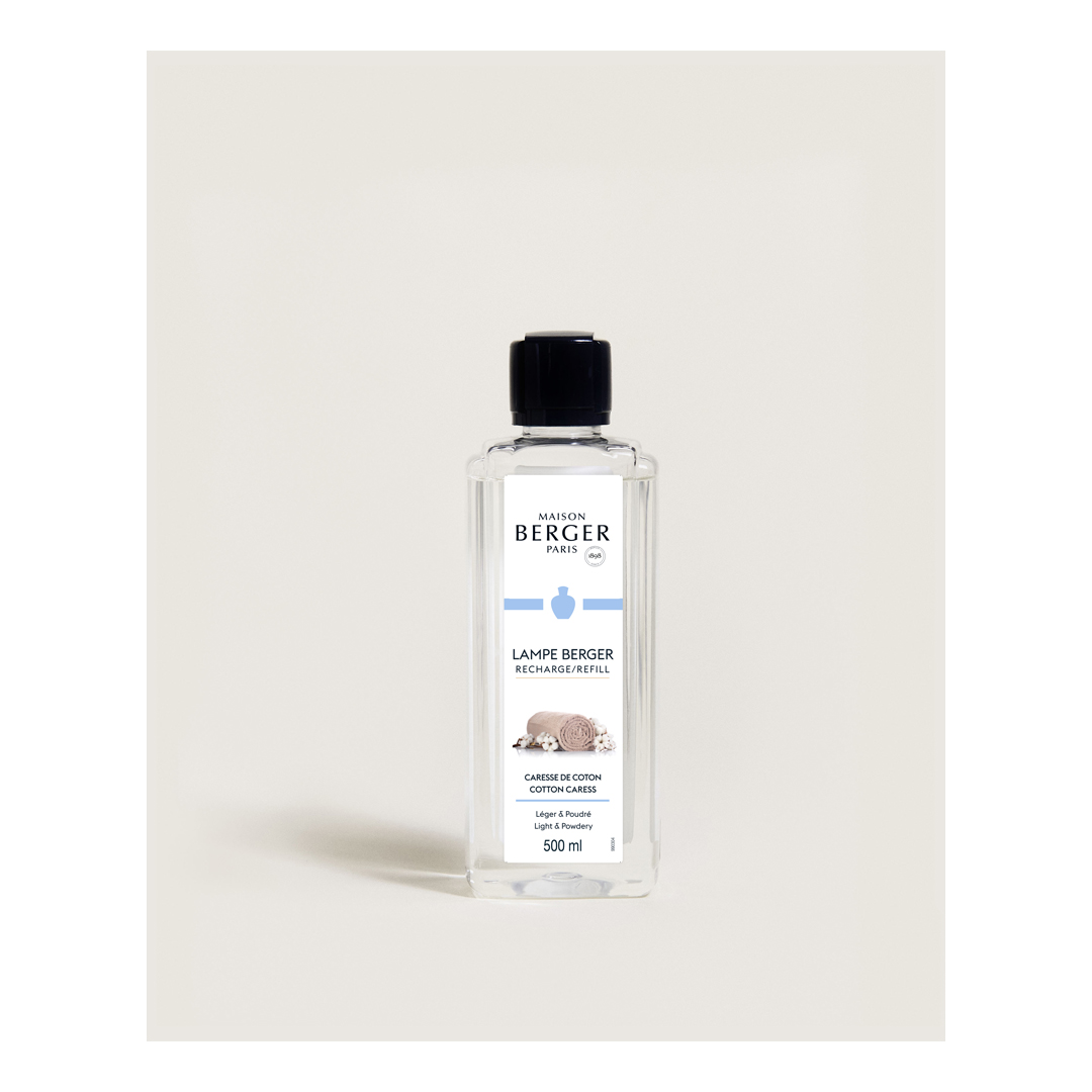Recarga Lámpara Berger Caresse de Coton 500ml. Fragancia suave y delicada con notas de vainilla, ideal para perfumar y purificar tu hogar.