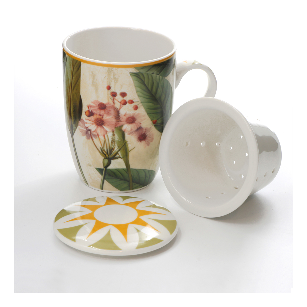 Fabricada en cerámica de alta calidad, esta taza presenta un acabado brillante que resalta los colores y detalles de su diseño, con flores rosas y hojas verdes sobre un fondo crema suave. La tapa decorativa, con detalles en amarillo y verde, permite mantener la bebida caliente por más tiempo y evita derrames, convirtiéndola en un accesorio ideal para el té o infusiones.