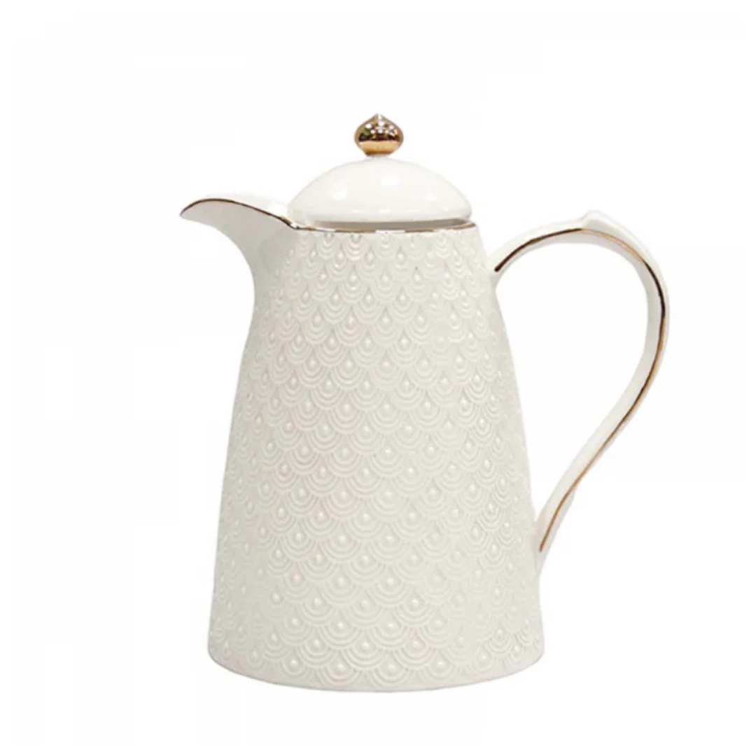 El termo de porcelana Marquise de Ishela de 750 ml, con carcasa de porcelana decorada en relieve y doble sistema de vidrio aislado, mantiene bebidas calientes o frías durante más tiempo.